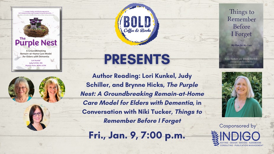 BOLD is honored to host a reading with Lori Kunkel, Judy Schiller, and Brynne Hicks, co-authors of The Purple Nest: A Groundbreaking Remain-at-Home Care Model for Elders with Dementia, in conversation with Niki Tucker, author of Things to Remember Before I Forget.