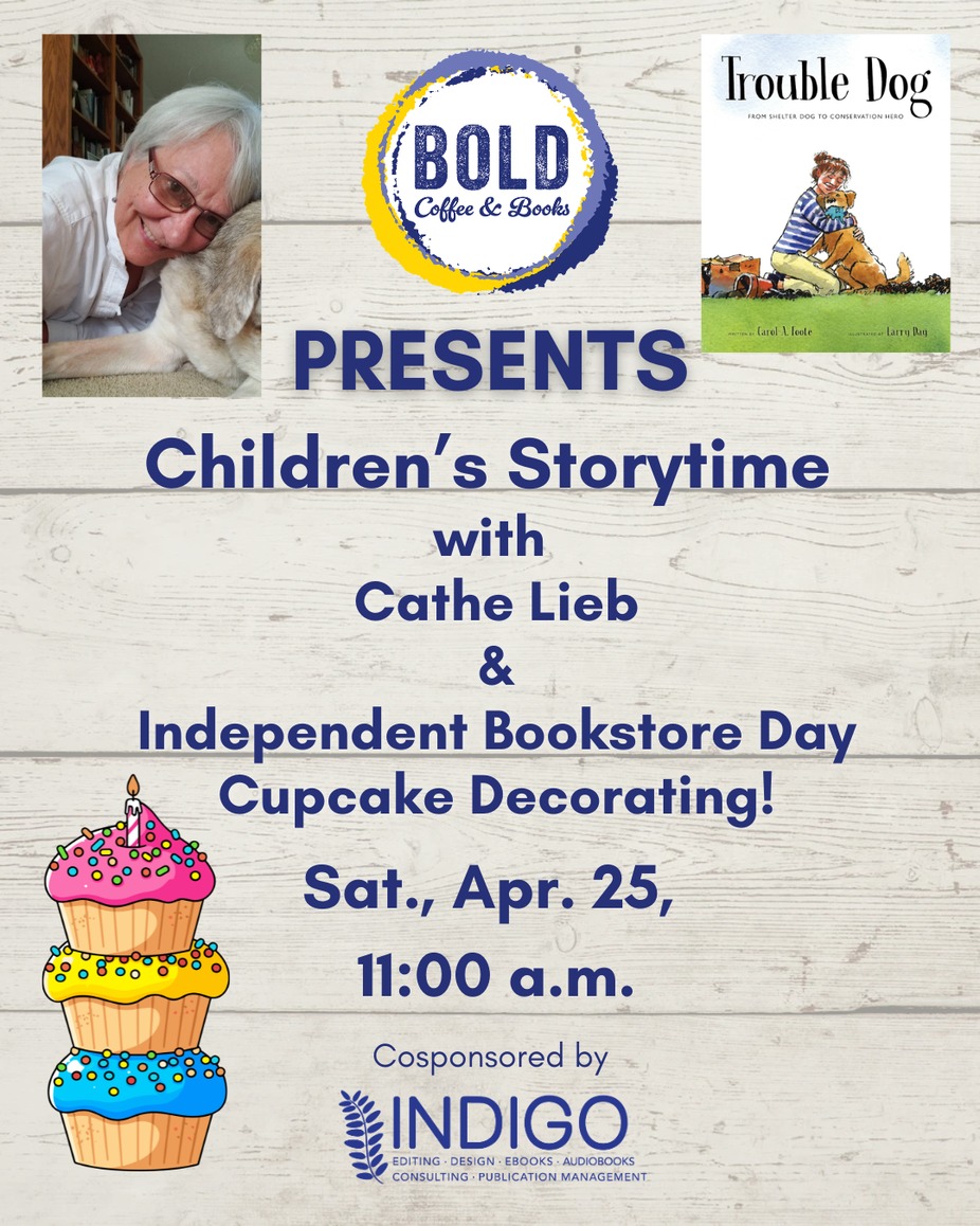 11:00 a.m.–12:00 p.m.: Children’s Storytime with Cathe Lieb, reading Trouble Dog, and cupcake decorating! These cupcakes are exactly the kind of treat that a “trouble” dog would get into. Let’s show some love for dogs and books…and CUPCAKES!